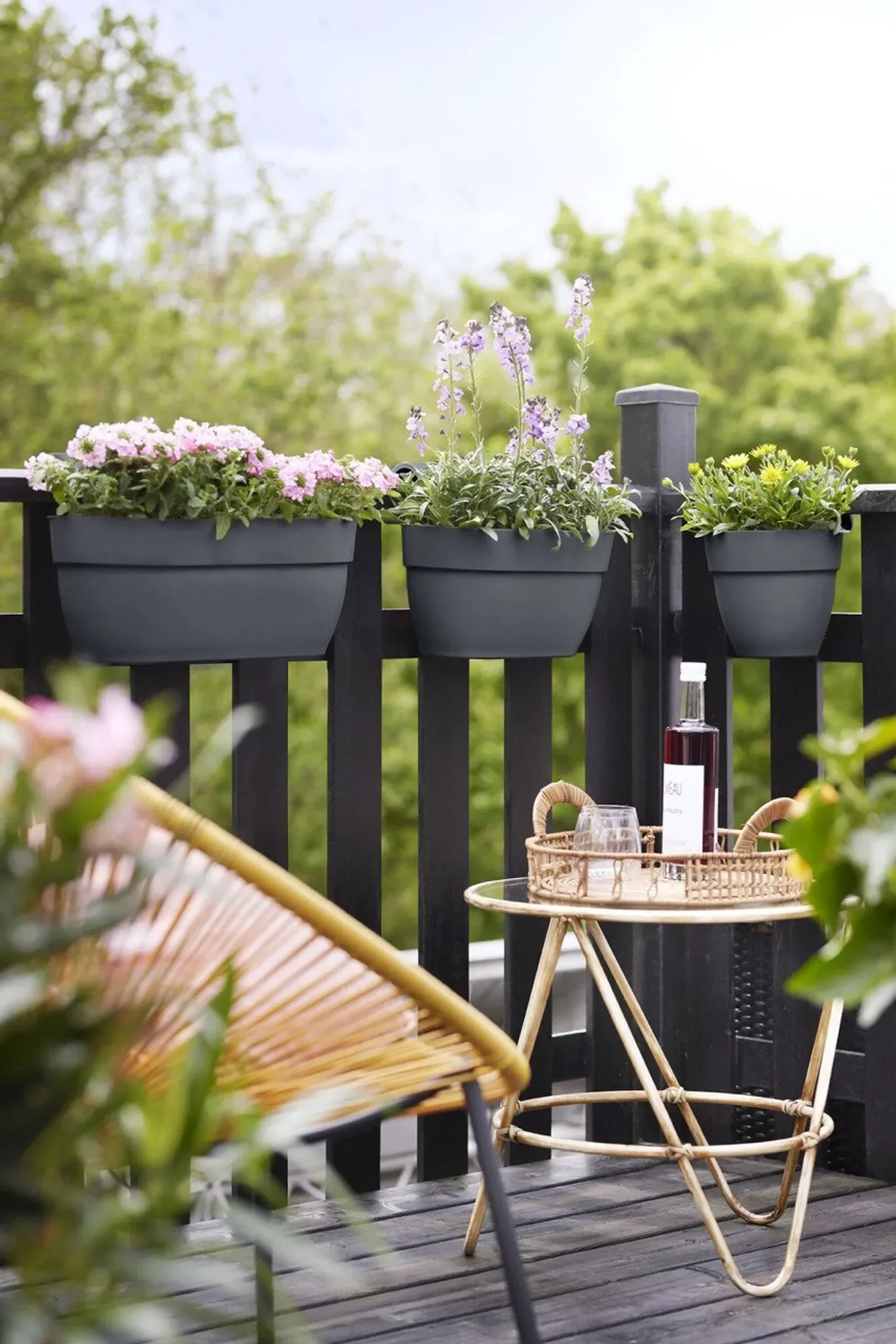 Highlights: Passend für die meisten Balkongeländer, integrierter Wasserüberlauf, modernes Design mit natürlicher Oberfläche, nachhaltig und vollständig recycelbar.