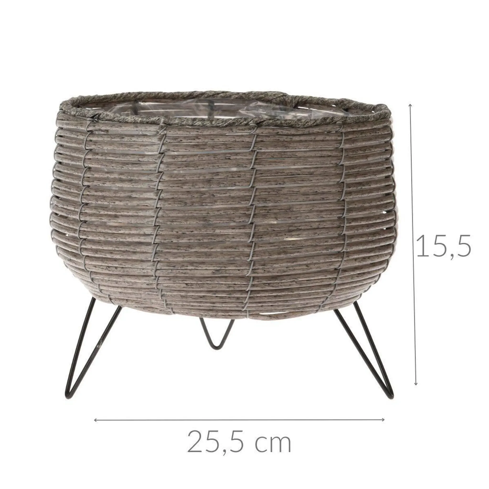 Dieser runde Blumentopf in Korbform auf Füßen verbindet dekorativen Landhausstil mit praktischer Funktionalität. Die geflochtene Oberfläche in zeitlosem Taupe setzt Pflanzen wirkungsvoll in Szene und verleiht Wohn- sowie Außenbereichen eine warme, gemütliche Atmosphäre.