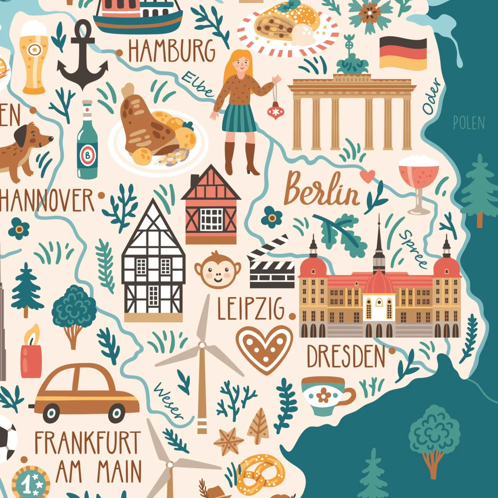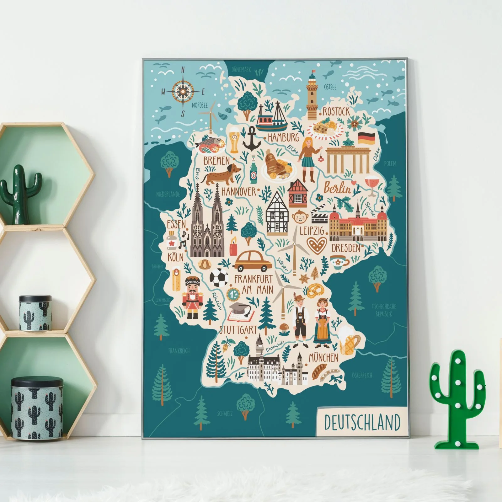 Dieses Kinder-Lernposter zeigt Deutschland in schönen Petrol- und Beigetönen und ist ideal für Kindergarten- oder Schulkindzimmer. Das Poster vermittelt spielerisch Wissen über das Land und dient gleichzeitig als dekoratives Element.