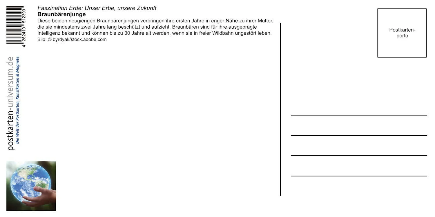 | Im Paket | 1 × Panorama-Postkarte „Braunbärenjunge“ |
