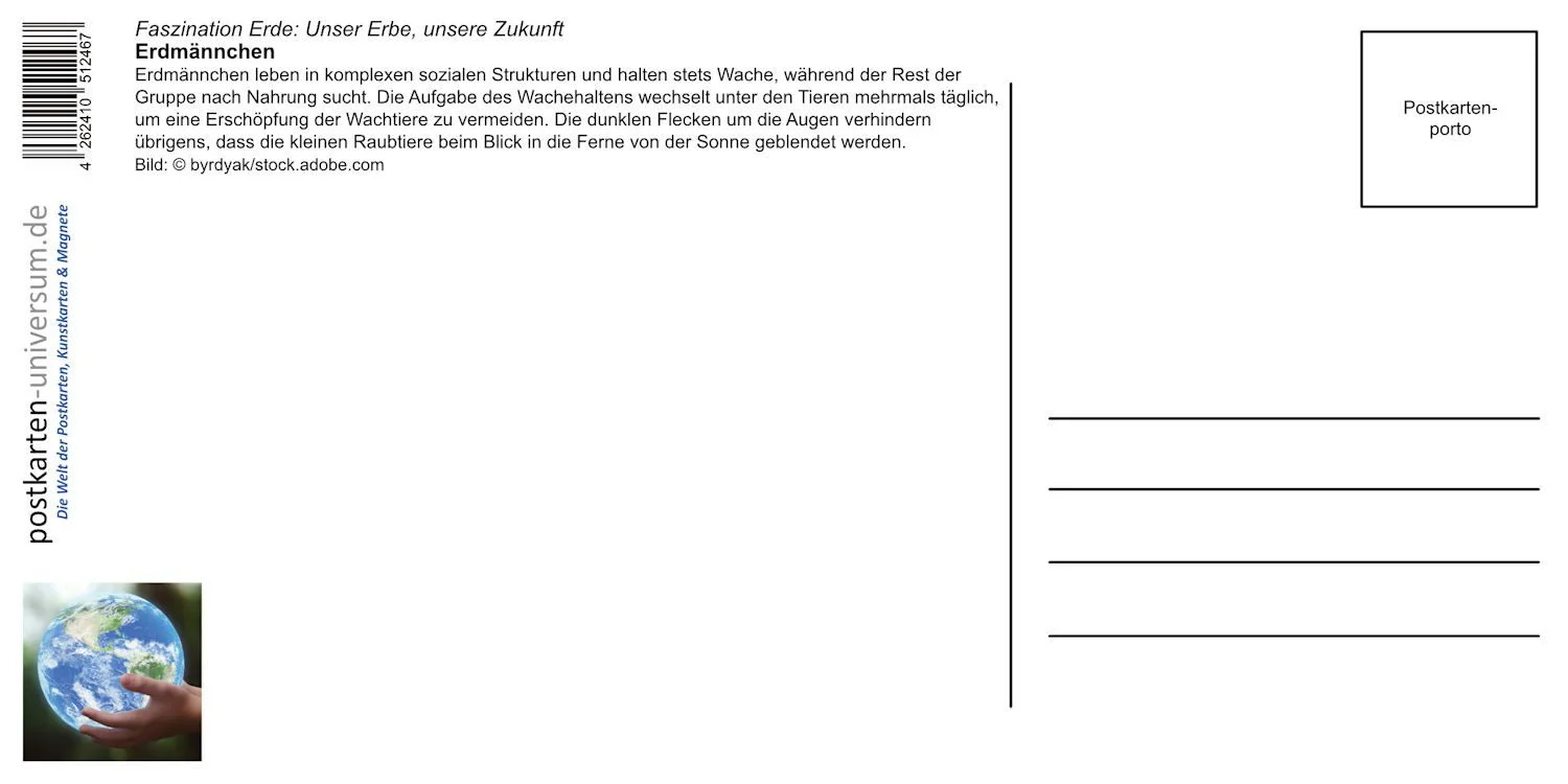 Diese Panorama-Postkarte aus der Reihe Faszination Erde: Unser Erbe, unsere Zukunft zeigt ein eindrucksvolles Naturmotiv in großzügigem Querformat. Die außergewöhnliche Fotografie bringt die charakteristischen Details der Erdmännchen besonders lebendig zur Geltung.