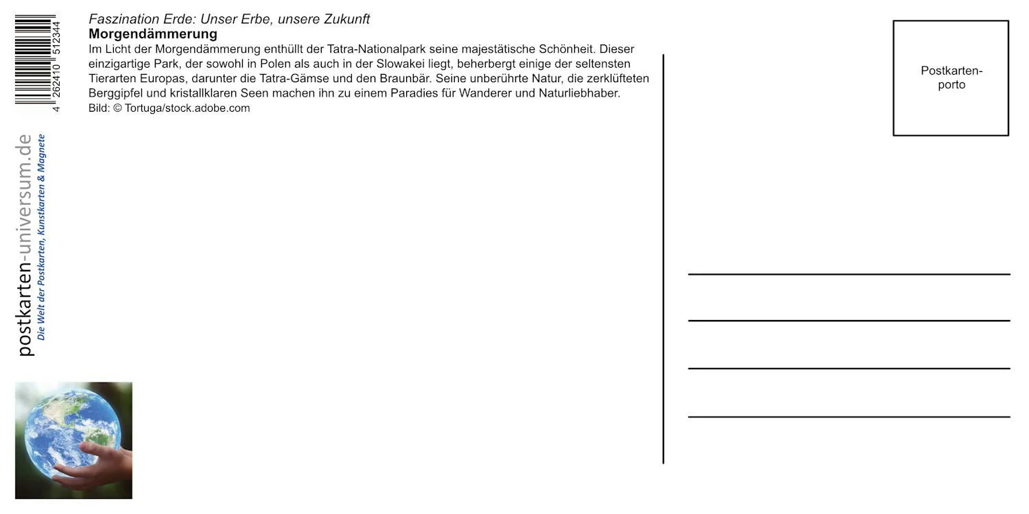 Ein erläuternder Text auf der Rückseite informiert über den einzigartigen Naturraum, der sich über Polen und die Slowakei erstreckt und Lebensraum seltener Tierarten wie der Tatra-Gämse und des Braunbären ist. Der professionelle Offsetdruck auf hochwertigem Postkartenkarton mit Dispersionslack-Versiegelung sorgt für brillante Farben und eine angenehme, langlebige Oberfläche.